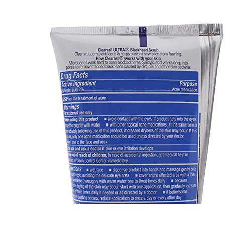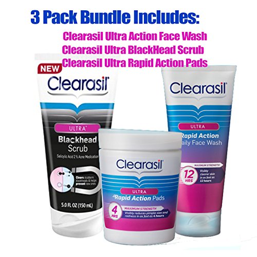 -. Feature : 3 PACK BUNDLE INCLUDES: Clearasil Ultra Rapid Action Face Scrub 5 Fl oz | Ultra Blackhead Scrub 5 Fl oz | Rapid Action Cleansing 90 Pads / Face Scrub - Visibly Clearer Skin in as little as 12 hours, Features exfoliating beads / Blackhead Scrub - Clears stubborn blackheads and helps prevent new ones from forming, opens blocked pores. Salicylic acid works deep into pores to remove trapped blackheads caused by dirt, oils, and other skin bacteria. / Pads - Visibily clearer skin in as fast as 4 hours, Exfoliating action helps to open blocked pores / Rapid delivery of pimple fighting active, Use everyday in the morning and evening for visibly clearer skin