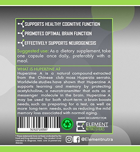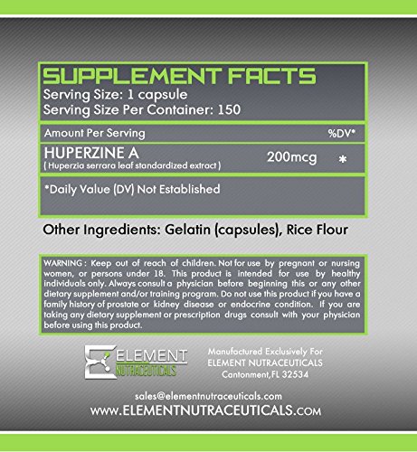 -. Binding : Health and Beauty -. Brand : Element Nutraceuticals -. EAN : 0767637193597 -. Feature : Huperzine-A is a cognitive enhancer that inhibits an enzyme that degrades the learning neurotransmitter, acetylcholine; due to this, a relative increase occurs / Supports healthy cognitive function -. IsAdultProduct : 0 -. Label : Element Nutraceuticals -. Manufacturer : Element Nutraceuticals -. MPN : ENHA -. PackageQuantity : 1 -. PartNumber : ENHA -. ProductGroup : Health and Beauty -. ProductTypeName : HEALTH_PERSONAL_CARE -. Publisher : Element Nutraceuticals -. Studio : Element Nutraceuticals -. Title : HUPERZINE A (200mcg x 150ct) by Element Nutraceuticals - Supports Healthy Cognitive Function -. UPC : 767637193597