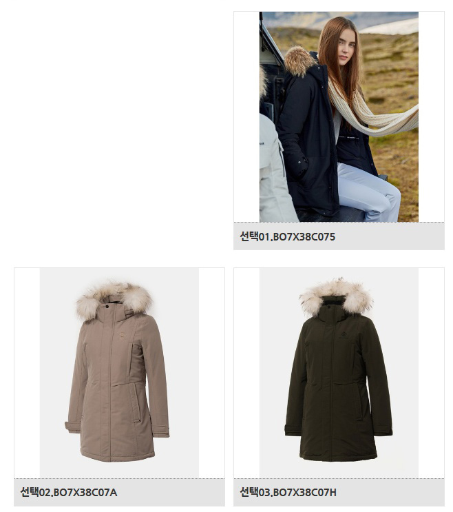 - 겉감: 폴리에스터 100%. 안감: 나일론 100%. 배색: 아크릴 56%, 모 24%, 폴리에스터 17%, 폴리우레탄 3%. 후드털: 천연모피(너구리). 충전재: 오리솜털 80%, 깃털 20%. 중량(90사이즈기준) : 220g