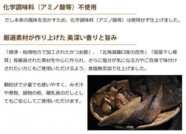 | 焼津・枕崎地方の鰹節、北海道羅臼産の昆布、国内産椎茸を使用しています。食塩・食品添加物・化学調味料は使用しておりません。塩分93%カット(日本食品標準成分表2010「顆粒風味調味料」ナトリウム値との比較)で食塩を気にされている方や小さなお子様にもおすすめです。 |