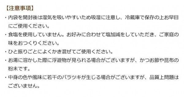 | 原材料 | 名称:かつおだしの素 かつお節粉末、甜菜糖、酵母エキス、昆布粉末、椎茸粉末 |