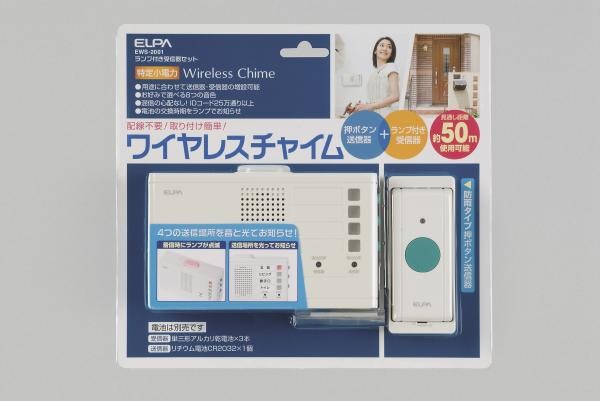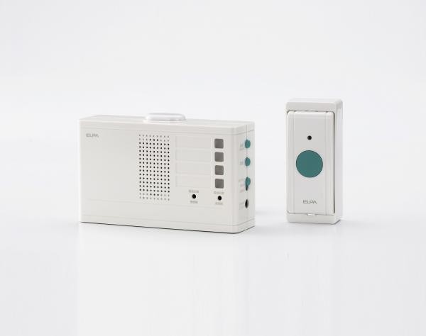 | ランプ付受信器+押ボタン送信器セット。配線不要のワイヤレスチャイム。報知・連絡を8種類の音とランプでお知らせするランプ付受信機と、お部屋からの呼び出しに便利な押ボタン送信器がセットになりました。 |