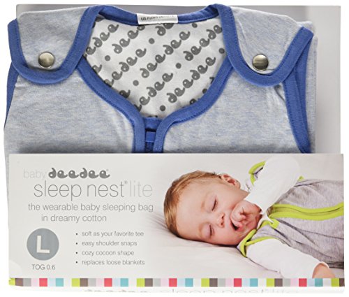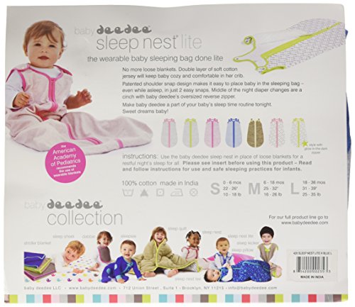 The Baby Deedee Sleep Nest Lite Nest is a wearable blanket for babies and toddlers 0-36 months. Designed in a comforting cocoon-like shape to help baby feel cozy and secure, the sleep nest's 3 sizes will keep your baby comfy at night from the newborn stage until she is ready to move out of the crib. Unique shoulder snaps make it easy to place baby into the sleep nest, even while sleeping, in just 2 easy snaps. Baby Deedee is currently available in 2 styles original and with glow-in-the-dark zipper.Feature