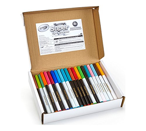 Crayola 80 Count Super Tips Markers have a unique, durable tip that's smooth, not scratchy. Use the side for coloring large areas & the tip for adding details! Look inside the box for these fun-scented markers: Cherry, Wild Berry, Orange, Lemon, Forest Pine, Fresh Air, Bay Breeze, Vanilla, Burnt Marshmallow, Spice, Honeysuckle & Green Apple.Feature