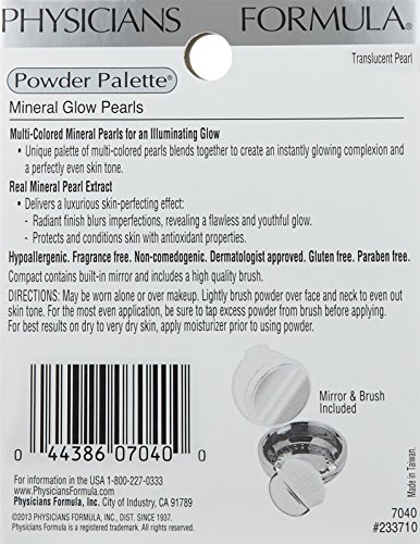 Studio : Physicians Formula, Inc. Publisher : Physicians Formula, Inc. Binding : Misc. Product Description Includes mirror and brush. Creates a skin-perfecting luminous glow. Multi-colored mineral pearls for an illuminating glow. Unique palette of multi-colored pearls blends together to create an instantly glowing complexion and a perfectly even skin tone. Real mineral pearl extract delivers a luxurious skin-perfecting effect: Radiant finish blurs imperfections, revealing a flawless and youthful glow; Protects and conditions skin with antioxidant properties. Hypoallergenic. Fragrance free. Non-comedogenic. Dermatologist approved. Paraben free. Compact contains built-in mirror and includes a high quality brush. Since 1937. Made in Taiwan.