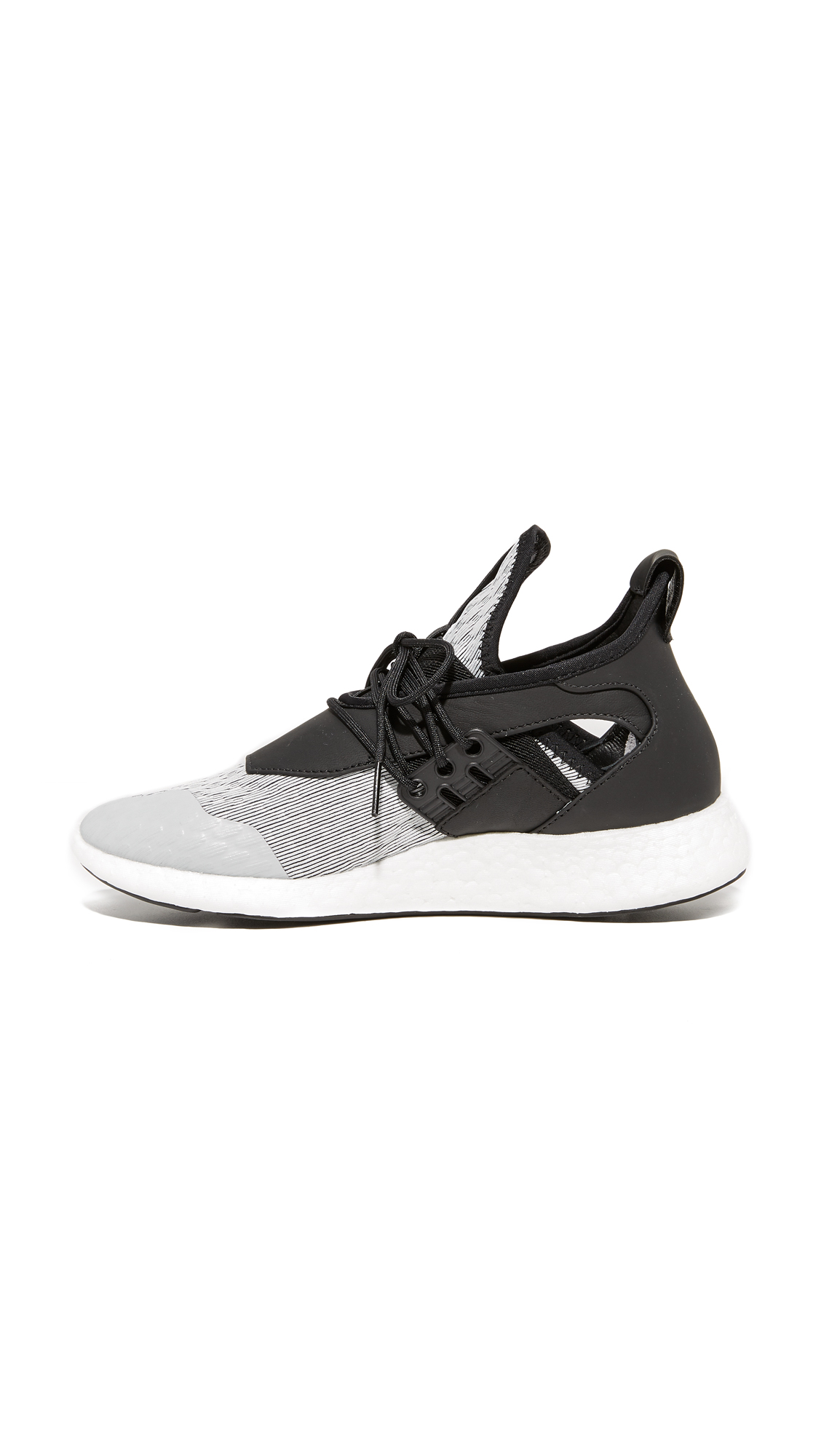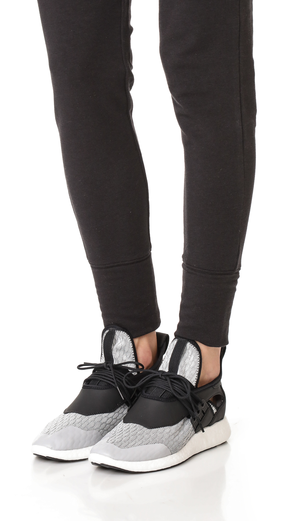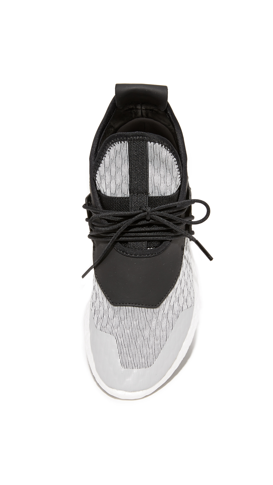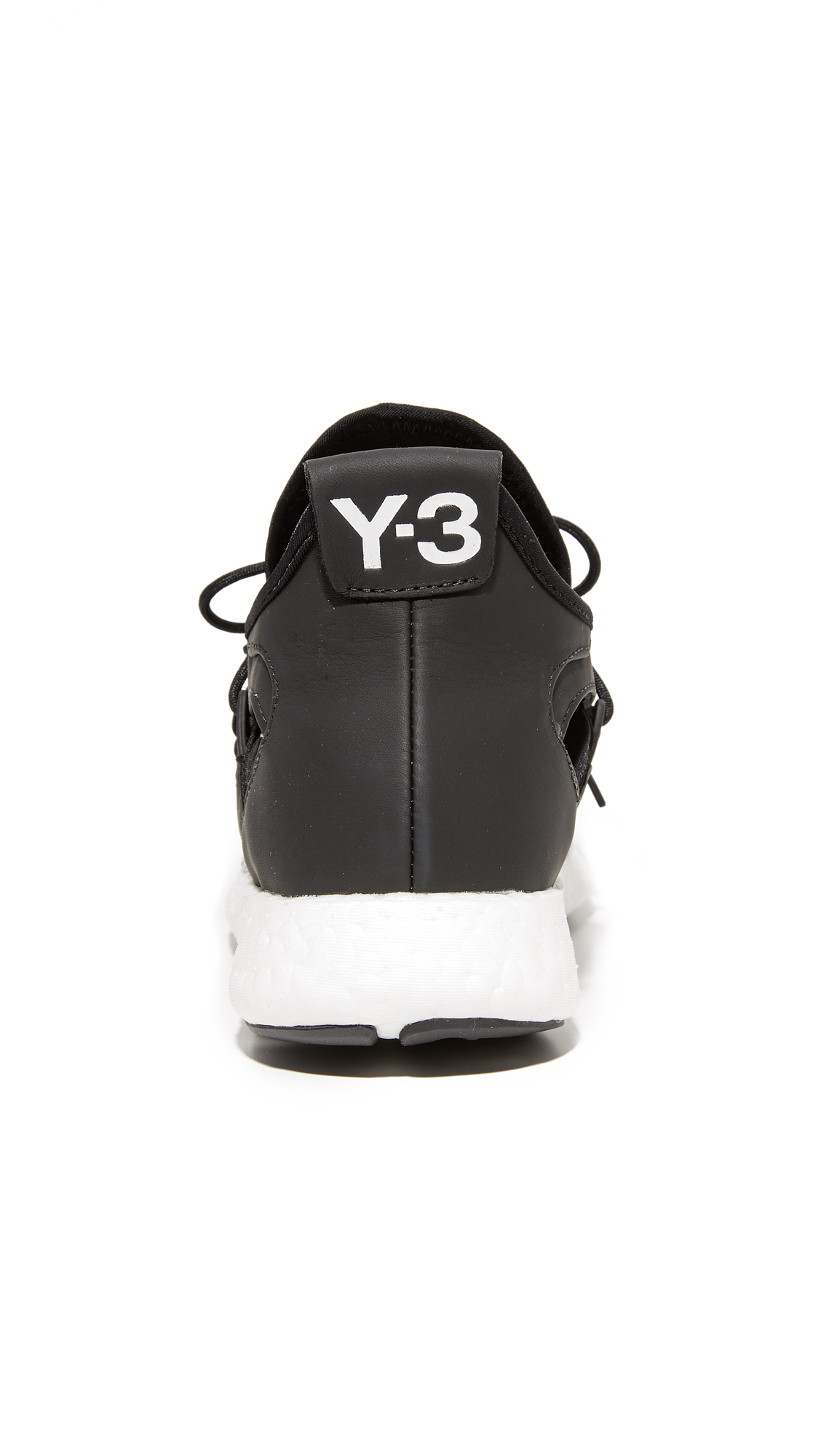Cutout Y-3 sneakers composed of neoprene and sculpted leather panels. Slim laces and a wide elastic overlay secure the polka-dot sock. Foam platform and rubber sole.