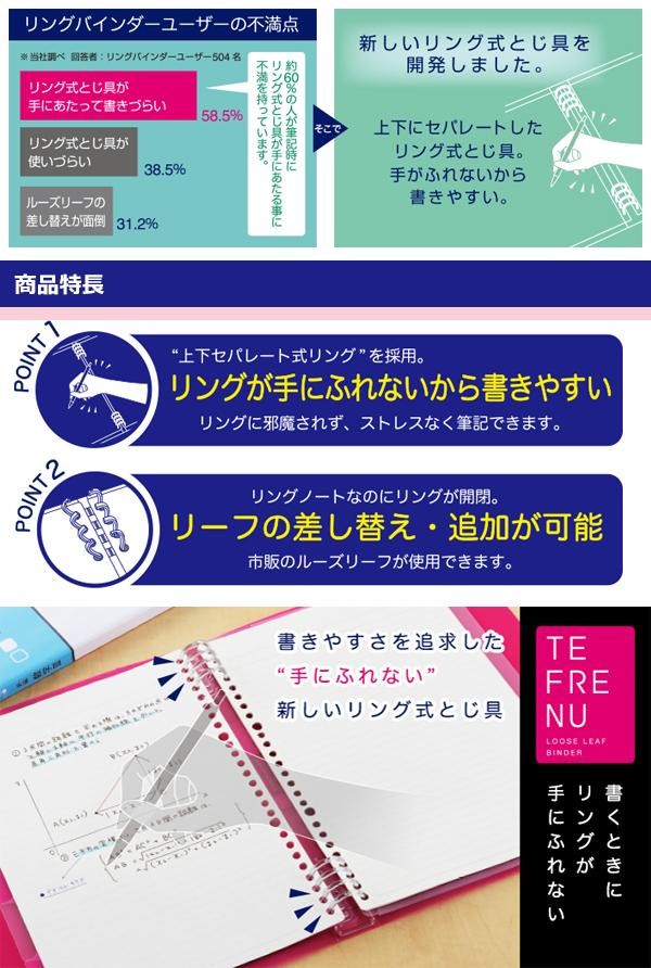 | リングを上下セパレートにしたので、手が触れなくて書きやすいです。リングはワンタッチで開閉できるので、手軽にリーフの差替え・追加ができます。市販のルーズリーフが使用可能。 |