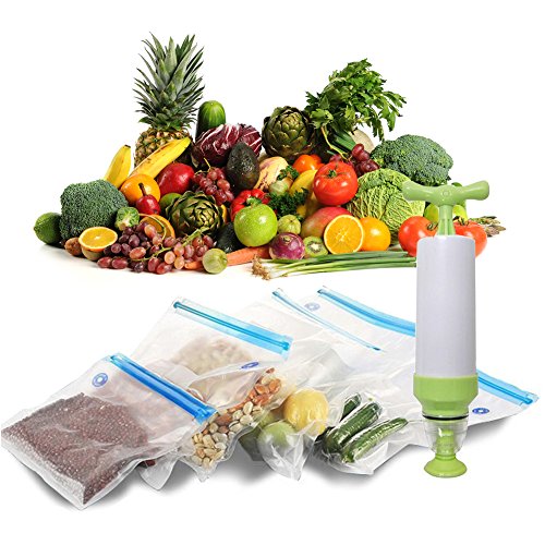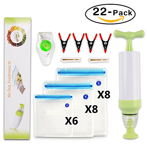 Nelipo Reusable Vacuum Sealed Bags - 22 BPA Free Food Vacuum Sealed Bags, with 1 Hand Pump, 2 Bag Sealing Clips and 4 Sous Vide Clips, Practical for Food Storage & Cooking