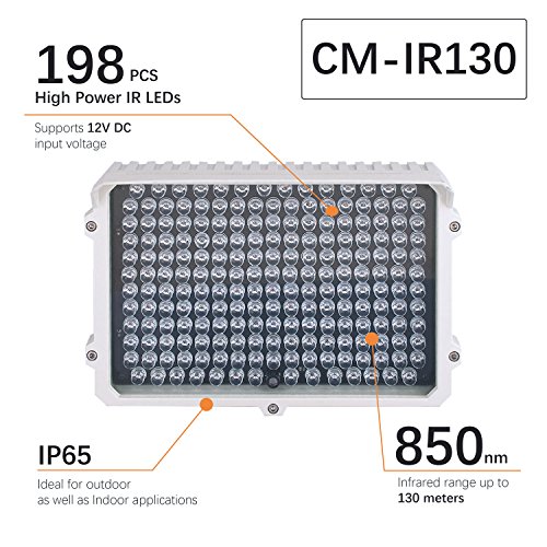 CMVision Amazon Store is only sales channel for CMVision IR130 IR Illuminator, We don't have response for any Fake wrong wave length and LED Chip from other seller in Amazon. Only sensitive with Sony or Sharp CCD Camera and lots of IP CMOS camera might not work with 850nm wavelength. Please be careful to read your camera specification first before buy! Increase the night vision for your color day/night surveillance cameras. This long range, 114 high power LED, indoor/outdoor, IR illuminator lights up the night for your monochrome (B&W) CCD or color day/night cameras with an effective IR range of 300-400 feet (100-130 meters) and wide IR projecting angle. Low operating costs, automatic CDS power control auto-powers unit only in low light situations for 24-hour detecting and monitoring.