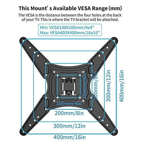 FITS 23"-55" TVs UP TO VESA 400 AND 66LBS This TV Wall Mount Bracket universal fits most of 23"-55" TVs up to 66 lbs with max mounting holes 400mm x 400mm.