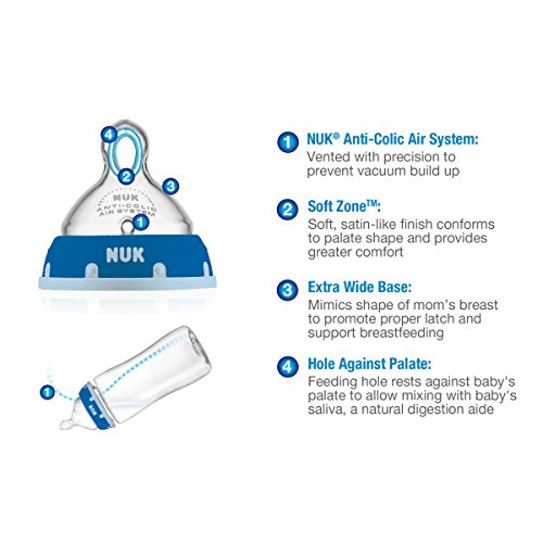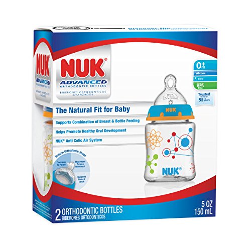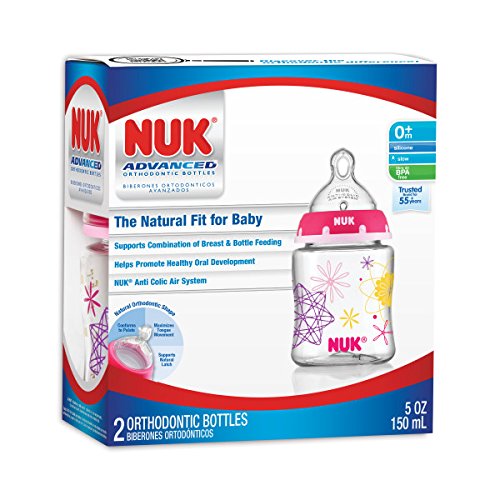 -. Binding : Baby Product -. Brand : NUK -. Color : Girl -. Department : baby-boys -. EAN : 0885131627971 -. Feature : Latest breakthrough in orthodontic bottles; Comes in pack of (2) with assorted colors and patterns / Features NUK Advanced Orthodontic Nipple that supports healthy oral development and features Soft Zone technology for greater comfort / Natural shape nipple mimics Mom's so you can combine breast and bottle feeding / Features the advanced NUK Anti-Colic Air System which helps to reduce colic / Drinking hole specially located at the top side of the nipple - not the tip like round nipples - that promotes better, easier digestion -. Label : NUK -. Manufacturer : NUK -. Model : 62797 -. MPN : 62797 -. PackageQuantity : 1 -. PartNumber : 62797 -. ProductGroup : Baby Product -. ProductTypeName : BABY_PRODUCT -. Publisher : NUK -. ReleaseDate : 2015-03-19 -. Size : 5 Ounce -. Studio : NUK -. Title : NUK Advanced Orthodontic Bottle in Assorted Colors, 5-Ounce, 2 Count -. UPC : 713331129318