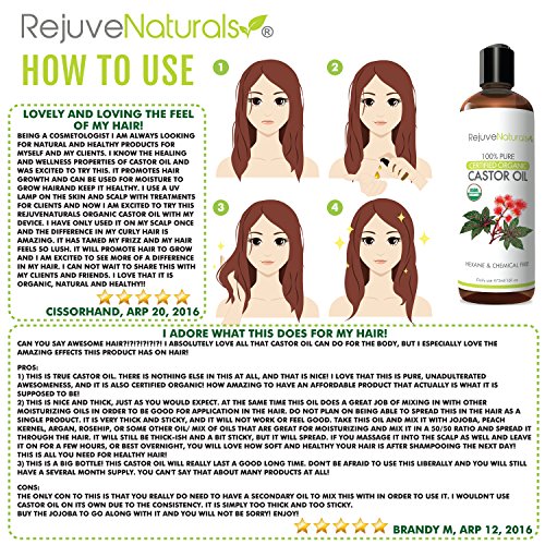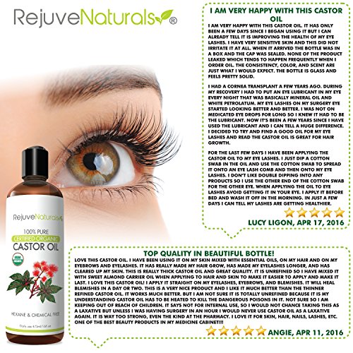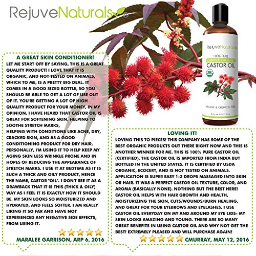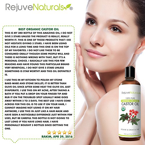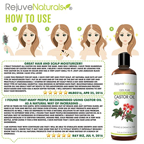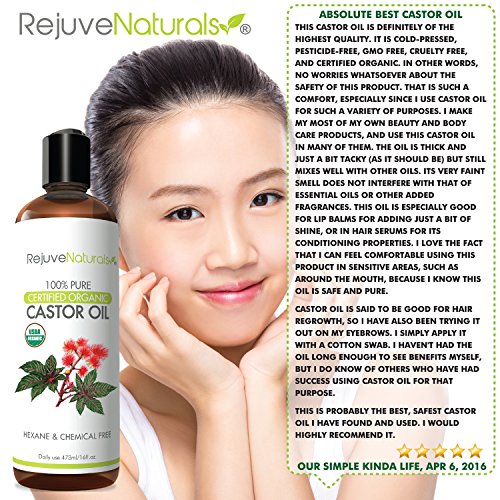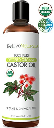 Castor Oil (16oz) USDA Certified Organic, 100% Pure, Cold Pressed, Hexane Free by RejuveNaturals. Boost Hair Growth for Eyelashes, Eyebrows & Hair. Natural Dry Skin Moisturizer for Women & Men