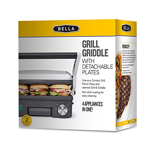 The BELLA 4-in-1 Contact Grill Griddle and Panini Press does it all. It includes detachable, easy to clean, non-stick grill and griddle plates. Used as a Contact Grill for steaks up to 2 Inch thick or a Panini Press for cafe quality sandwiches. With the ability to open 180 degrees it quickly converts to a full size, flat Grill or Griddle. Setup one side with the Grill plate for burgers with perfect grill lines while setting up the other side with the Griddle plate to Sautee mushrooms and onions. Set both sides with the Griddle plates and griddle perfect pancakes on one side and eggs and bacon on the other side for the whole family. The temperature control dial allows you to choose the cooking temperature while the non-skid feed prevent unwanted spills. Let BELLA give you grilling in the home at its very best.Feature
