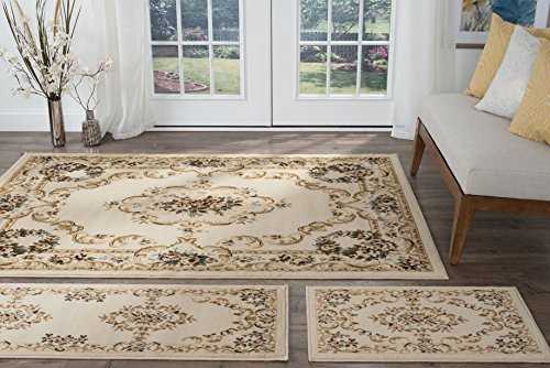 Bring timeless elegance to your home with this area rug. This gorgeous design features a charming floral medallion pattern in shades of beige, red and green on a classic beige background. The beige border is finely detailed and highlighted with brown, green and red. The traditional design is complemented by durable 100% polypropylene construction for confident placement in any setting. It is sure to provide comfort and delight for years to come. This rug is available in several individual sizes and as a three piece set so you can harmonize your theme throughout your home. It is easy to care for, vacuum regularly to maintain its appearance. Spot clean as needed with mild detergent, do not dry clean or bleach.Feature