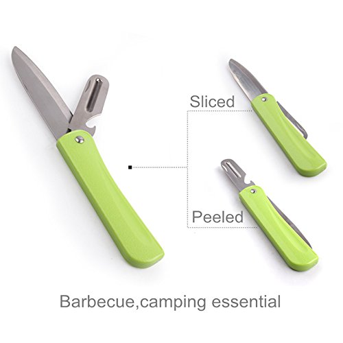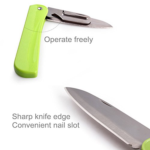 Special: 1) When you use the knife function,the stainless steel blade locks in the open position to prevent accidental closing. 2)This fruit folding knife handle are made of sturdy plastic which is lightweight,comfortable and non-slip,fatigue-reducing grip. 3) The edge of the fruit knifepeeler has a nail groove in which make it easy to pull in and pull out easily. 4)Razor sharp,pay attention to safety,away from children 0