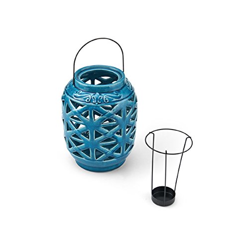-. Binding : Misc. -. Brand : Elements -. Color : Blue -. EAN : 0028225897366 -. Feature : This Elements teal ceramic mid century lantern adds a pop of color to your living space while introducing ambient lighting that creates an inviting atmosphere / This ceramic lantern features a rich teal finish, with a pierced window pane pattern that allows candlelight to shine through / The handle on top makes it easy to move the lantern to different locations / An interior metal candleholder is Removable for quick and simple changing of tea lights / Lantern measures 8-1/2 inches high; candles not Included -. Label : Lifetime Brands -. Manufacturer : Lifetime Brands -. Model : 5173136 -. MPN : 5173136 -. PackageQuantity : 1 -. PartNumber : 5173136 -. ProductGroup : Home -. ProductTypeName : HOME -. Publisher : Lifetime Brands -. Studio : Lifetime Brands -. Title : Elements Mid-Century Ceramic Lantern -. UPC : 028225897366