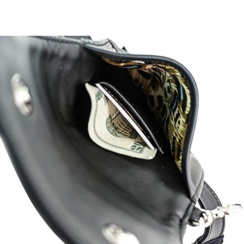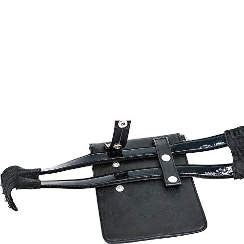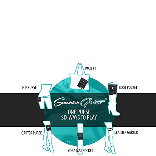 -. Feature : Size small: leg strap fits US pant sizes 0-10 / Size medium: leg strap fits US pant sizes 12-20 / Black faux leather pocket and leg straps, silver colored hardware decals / Magnetic snap pocket closure / Smaller internal pocket to securely carry credit cards and ID