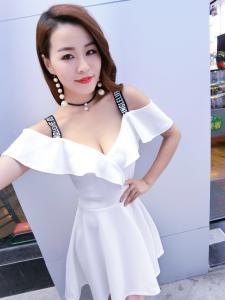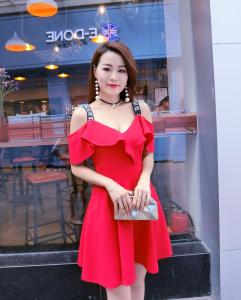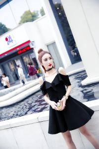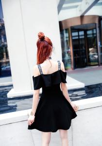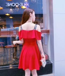 膝上ワンピース フレアスカート ハイウエスト ロゴストラップ オフショル 胸フリル プチプラ 大人ドレス トレンド
