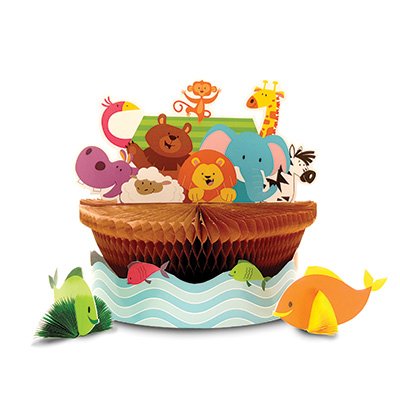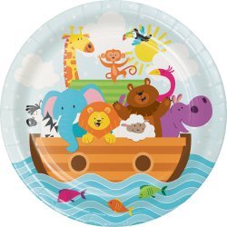 NOAH’S ARK BABY SHOWER PARTY SUPPLIES: 24 each Large and Small Paper Plates, Cups; 32 Napkins; 2 Different Games; 1 Large Centerpiece; 1 “Mom to Be” Magnet – Everything you need to put on a great shower for 24 guests