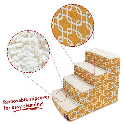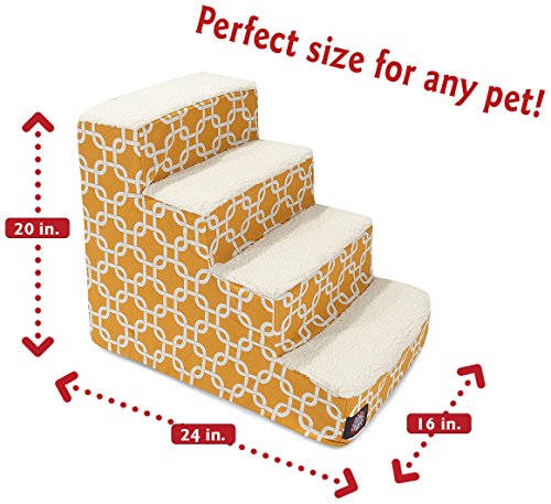 Studio : Majestic Pet Publisher : Majestic Pet Binding : Misc. Product Description Majestic Pet Products 4 Step Pet Stairs are perfect for older dogs and cats suffering from arthritis, painful joints, overweight bodies or hip dysplasia. Give your pet back their independence and allow them to easily access couches, ledges hard to reach spaces that they struggle to climb. Features a machine washable slipcover to easily wash off dirt, stains, spills, etc. You can quickly and easily install it. Assembly cushion fittings offer enough stabilization to keep your pet from injury itself. Help dogs and cats have fun indoors, especially on rainy and snowy days, and accompany your pet growth happily. Designed and assembled in the USA with imported materials. Highest quality dog / cat stair is guaranteed. Dimensions: 24" x 16" x 20" (L x W x H) Weight: 7.4 lbs Cover Material: Polyester Stairs Material: PP Package 1 x Majestic Pet Dog / Cat Steps 1 x Slipcover