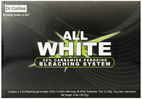 The All White Bleaching System is the perfect at-home teeth whitening system for those looking for an economic alternative to dentist administered whitening or simply wishing to maintain their pearly whites. The system contains 2 large 5mL gel syringes of 22% Carbamide Peroxide gel, 4 Boil-n-Bite trays, a designer tray case, and a free sample of Dr.Collins All White Toothpaste. Each 5ml syringe provides approximately 10 dual arch applications - twice the amount of gel provided in most other whitening kits. Convenient and easy, All White Bleaching System will give the bright white smile you deserve!Feature