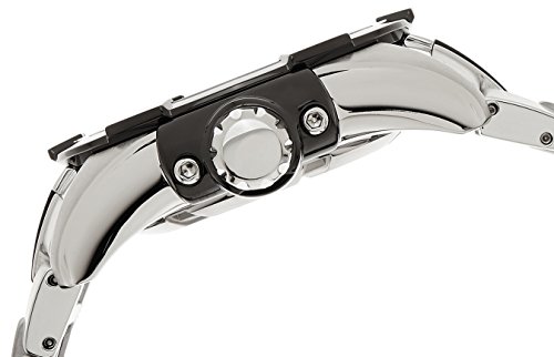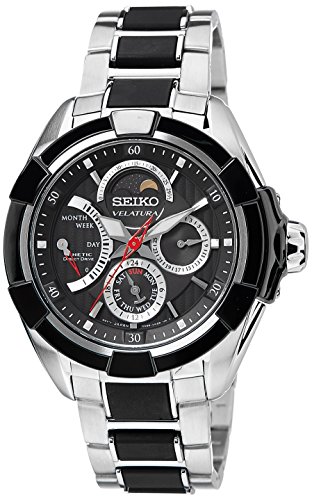 Stainless steel case with a stainless steel and black polyurethane bracelet. Fixed stainless steel bezel. Black dial with luminous silver-tone hands and index hour markers. Minute markers around the outer rim. Dial Type: Analog. Luminescent hands and markers. Three multi-function sub-dials displaying: 24 hour / day of the week, date and moonphase. Kinetic movement. Scratch resistant sapphire crystal. Screw down crown. Solid case back. Case diameter: 46.3 mm. Round case shape. Water resistant at 100 meters / 330 feet. Casual watch style. Seiko Velatura Kinetic Multi-function Black Dial Two-tone Mens Watch Srx009.Feature