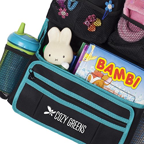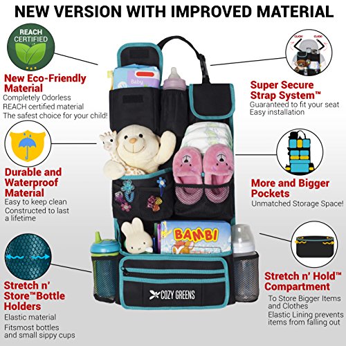 ORGANIZE CLUTTER, STAY SANE. Our redesigned backseat auto organizer features a NEW Stretch 'n Hold™ jumbo sized compartment for the ultimate hold everything storage solution, complete with a detachable pocket for grab & go convenience. The Cozy Greens® organizers utilize our unique Stretch 'n Store™ bottle holders, and MORE storage pockets than competitors' to maximize storage, and clear the clutter from your vehicle. No matter how many cars you have, the backseat organizer is an essential baby product.