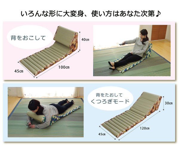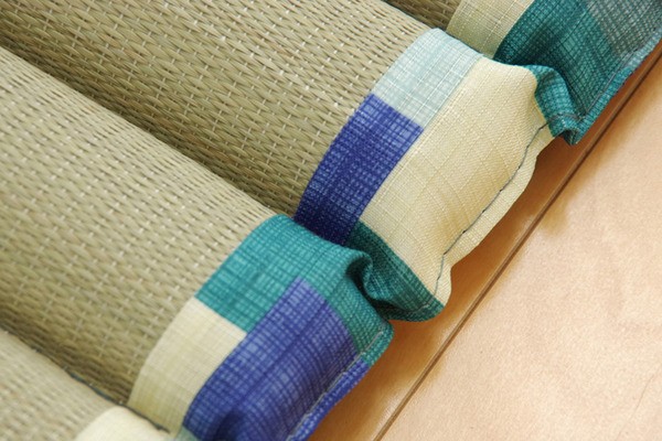 マリンデザインの明るくシンプルない草クッションです。組み合わせを変えることでお好みの高さに調整できます。胴部には、筒状の綿を使用しています。適度な凹凸により通気性があります。表面のい草によってさらっと快適にくつろげます。