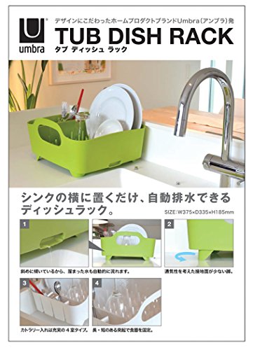 Studio : Umbra Publisher : Umbra Binding : Misc. Product Description The Tub dish drying rack by Umbra features a convenient all-in-one design for today's streamlined kitchen. Available in a variety of fashion colors such as this crisp white, Tub is constructed of durable, easy-to-clean, BPA-free molded material. Tub's self-draining design works both in the sink and on the counter. For counter-top use, the angled base collects and diverts water run-off back into the sink, eliminating the need for a bulky, unsightly drip-tray. Interior pegs allow dishes to be stacked in any direction and accommodate glassware as easily as plates and pots. The built-in utensil caddy is generously-sized for holding cooking tools and flatware. Designed with sturdy, generous handles for maximum portability, Tub is easily transferred fully-loaded from sink to counter and back again, and can also double as a roomy dish-and-utensil caddy for parties and outdoor entertaining. Measures 15-inch by 14-inch by 7-1/2-inch. Patent-pending design by Rafael Urdaneta for Umbra - the worldwide leader in innovative, modern, casual and affordable design for the home. 0