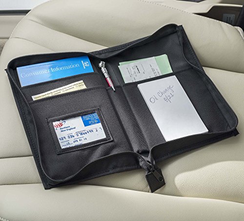 Inside pockets store auto and tire manuals, repair receipts, a tire gauge, and registration and insurance information