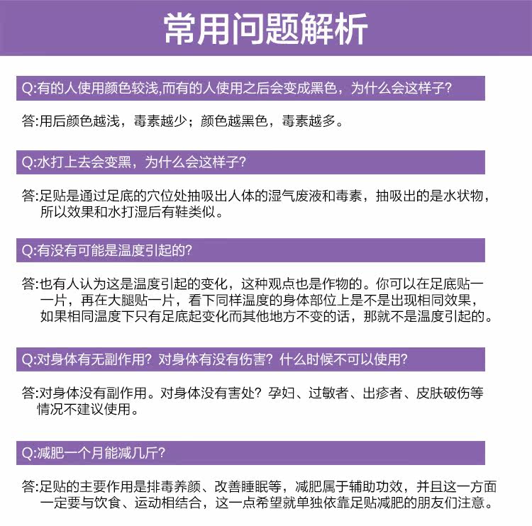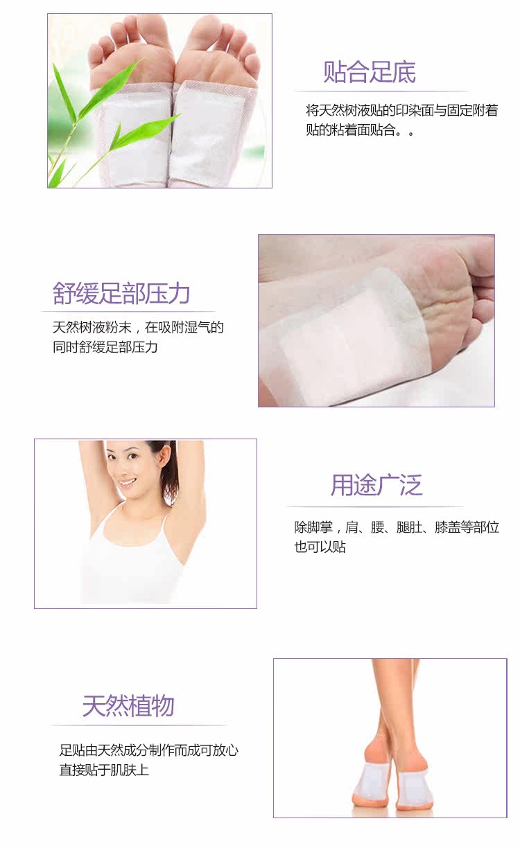 This detox patch adopts the concept of foot reflexology. It is purported to stimulate reflex points on the feet which removes toxic waste and restores balance to the body. Swelling happens because of poor circulation in foot and excess fluid accumulated in the intercellular. There are 520 kinds of active ingredients in bamboo sap for sterilization and eliminating odor. Bamboo Sap helps to suck out waste accretion in the foot which helps improve blood circulation and relieve tired feet. It also repairs skin's moisture barrier to keep moisture in, environmental irritants out making you feel more refresh. ______________________________________________________________________