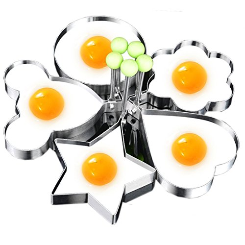 Excellent design for cooking eggs or pancakes for your lover as well as your family. Ideal for making pancakes, crumpets or fried. Perfect for egg muffins, mini pancakes, small omelettes, poached eggs, burgers more! Humanized plastic handle pulling, anti hot not injured. Compact and durable with enduring performance. Food grade stainless steel ring, not high temperature deformation, healthly and safety. Rotary handle design, easy to control and use. Easy to store after using. Material: Stainless steel Color: Silver Package Contents:5 X PCS egg moulds Heart Shape: 10.3*8.7*1.5cm Star Shape: 10*8.7*1.5cm Round Shape: 10.5*8.8*1.5cm Flower Shape: 10.2*8.8*1.5cm Micky Mouse Shape: 9*7.6*1.5cm Weight: approximately 32 grams each.