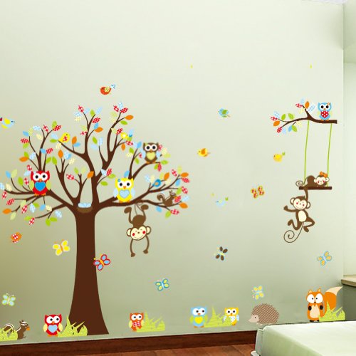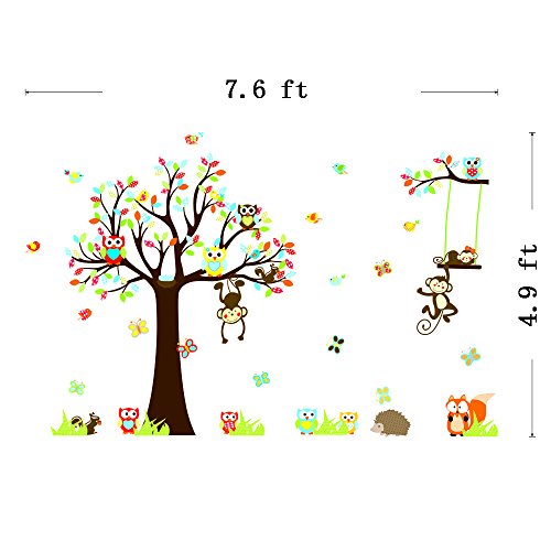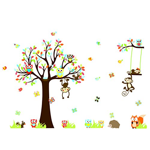 DaGouCartoon Forest Animal Owls Tree Swing Nursery Wall Stickers Wall Murals , Removable Art Wall Decals for Kids Girls Room Decoration