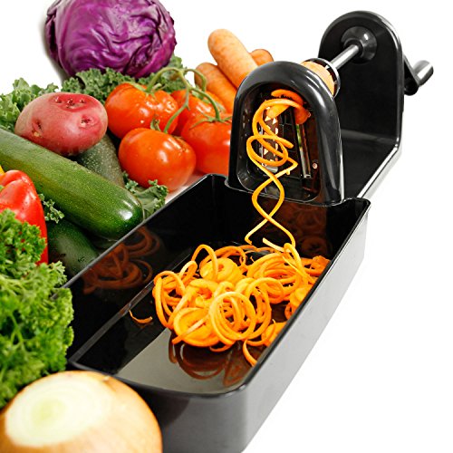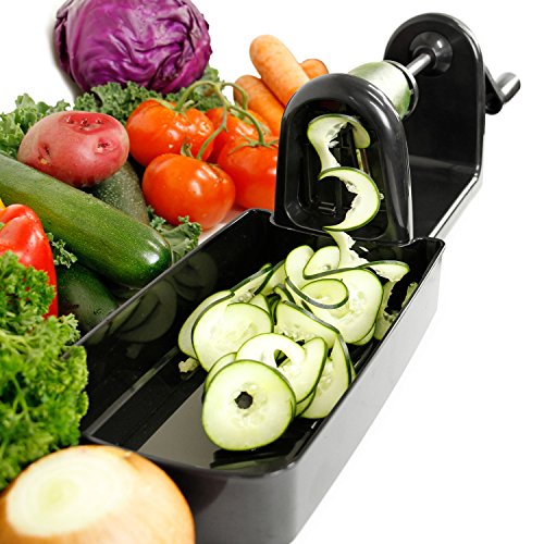 - QUICKLY TRANSFORM VEGETABLES & FRUITS: Quickly transform vegetables and fruits into beautiful and healthy noodles, shreds and chips. Spiral cut zucchini, cucumbers, potatoes, carrots, onions, squash, cabbages, apples, pears and so much more. It's fun and easy use, simple to clean, and all blades can be stored within the cutter or in the included blade case.