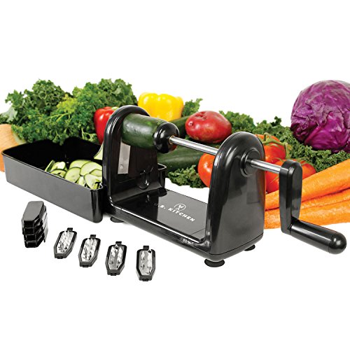 - 5 INTERCHANGEABLE BLADES: Very versatile with 5 styles of cutting blades, which allows you to use the appropriate blade you need for every cut style. Ribbon Cut Blade for straight ribbon like strands. 2 Thin Spiral Blades and 2 Thick Spiral Blades for very thin to thick long spiral strands like spaghetti and fettuccine.