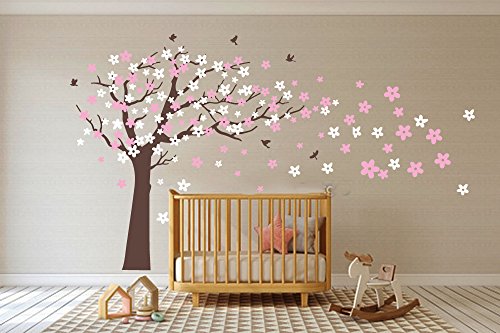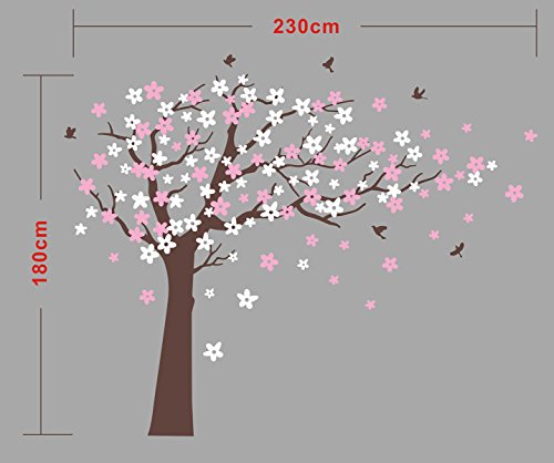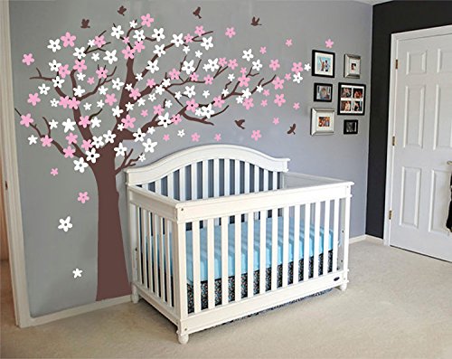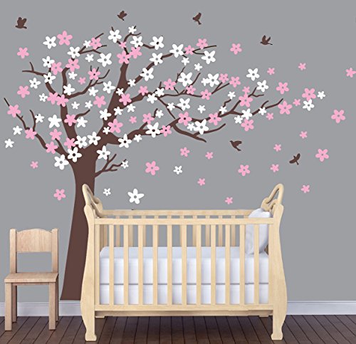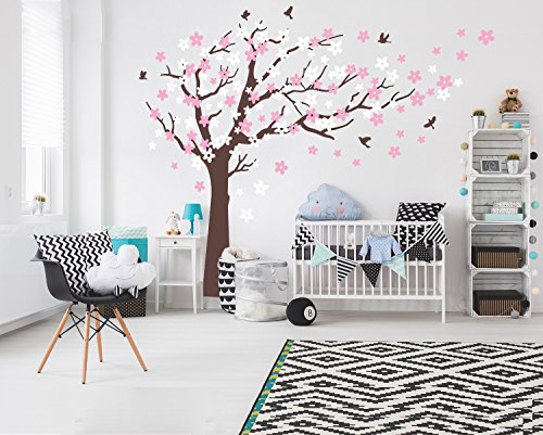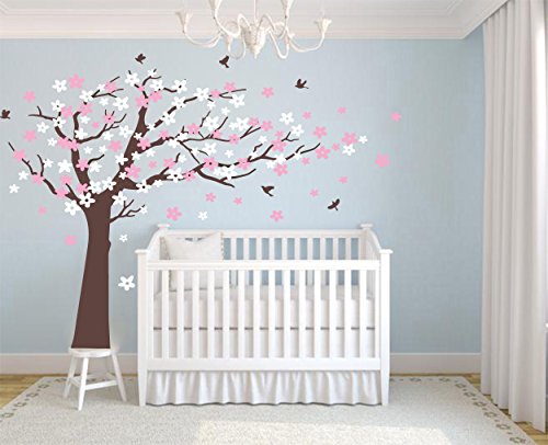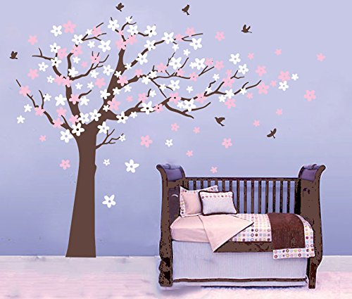 LUCKKYY Large Blooming White and Pink Flowers Tree with Birds Wall decals Wall Sticks for Nursery Baby Living Room wall art (Brown)