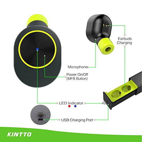 -. Binding : Wireless Phone Accessory -. Brand : KINTTO -. EAN : 0603894039493 -. Feature : TRULY WIRELESS EARBUDS >>> Easy to carry and without annoyance from getting noise when moving. A lighter and tighter design fits comfortably in ears. / DESIGNED FOR DRIVING >>> The separated two earbuds could be used together for stereo mode or used separately like a hand-free earpiece for driving. For the dual mode please follow the pairing instructions in manual / A WHOLE DAY PLAYING TIME >>> The playtime for the earpieces is about 3 hours but come with a mini and portable charging case with 450 mAh battery to provide the headphones a longer hours music and talking time. It can be used for a whole day with 100% full charge of charing case. / SMOOTH VOICE & STABLE CONNECTIVITY >>> BLUETOOTH V4.1 & CVC 6.0 TECHNOLOGY ensure smooth and clear voice and stable connectivity that stay seamlessly connected to all Bluetooth enabled devices like iPhone and Android phone, tablets and laptops within 33 feet. / RISK-FREE Purchase ! >>> KINTTO earbuds will support 1-year warranty and your pay will be refunded under no-negotiation -. Label : KINTTO -. Manufacturer : KINTTO -. PackageQuantity : 1 -. ProductGroup : Wireless -. ProductTypeName : WIRELESS_ACCESSORY -. Publisher : KINTTO -. Studio : KINTTO -. Title : True Wireless Earbuds, KINTTO Car Bluetooth Headphone, Mini Cordless Hands-free Bluetooth Headset Built In Mic, In-Ear Phone Headset with Charging Case for 12 Hours of Duration -. UPC : 603894039493