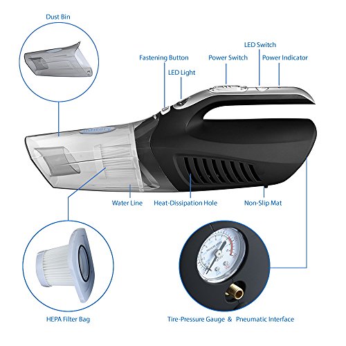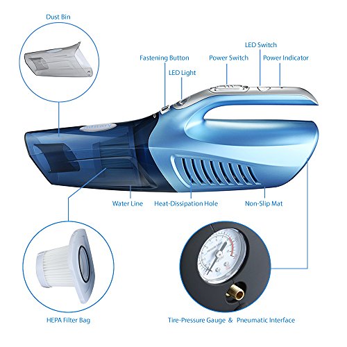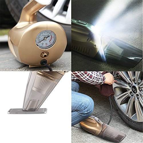 -. Feature : This 4-in-1 Car vacuum cleaner can be used to clean wet and dry debris. Multi-functions: dust absorption,LEDs lighting,tire pressure measuring,and tire inflation all in one / Strong suction 100W power with 4m power cord,it is also coming with flat crevice nozzle,dust brush and lengthen flexible hose for you to clean every corner of your car easily / With removable and washable HEPA filter,easy to clean,environmentally friendly and cost saving / Three Extra Valves are suitable for different kinds of tires and sporting equipments, such as basketball, soccer, beach volleyball, bike and so on, making it more convenient and widely use / Yacht streamline appearance design,convenient for disassembly.Easy and handheld to use by directly pluging into 12V car lighter socket
