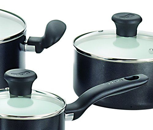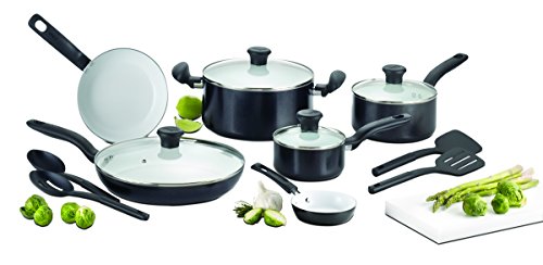 Product Description T-fal C921SE64 Initiatives Ceramic Nonstick PTFE-PFOA-Cadmium Free Dishwasher Safe 14-Piece Set Cookware, Black. The set includes: 8-Inch Fry Pan, 11-Inch Fry pan with lid, 1-Quart Sauce Pan with lid, 2-Quart Sauce Pan with lid, 5-Quart Stewpot with lid, One Egg Wonder, 4 nylon tools 0