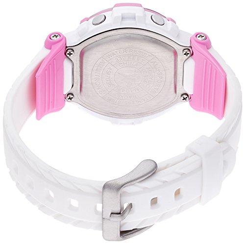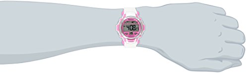 • Pink and white sport watch with LCD display that includes day, date, time, and seconds
