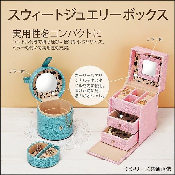 | ガーリーなオリジナルテキスタイルを内側に使用し、開いたときに見えるのがオシャレな仕様のジュエリーボックスです。ミラーも付いて実用性も充実!ハンドル付きで持ち運びに便利な小ぶりサイズです。 |