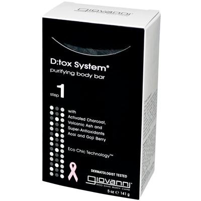 Giovanni Step-1 DTox System Purifying Body Bar Soap, 5.3 Ounce -- 6 per case. Begin with Step 1 D:Tox System, Purifying Body Wash or Body Bar, featuring a unique combination of activated charcole and volcanic ash that dives deep into pores, absorbing the days toxins, readying them for removal Shelf Life: 999 days