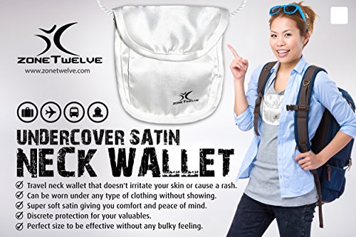 -. Binding : Apparel -. Brand : ZoneTwelve -. ClothingSize : One Size -. Color : White -. Department : unisex-adult -. EAN : 0820103424424 -. Feature : SUPER SOFT made completely out of satin giving a light, smooth and very soft feeling on your skin. / THE MOST COMFORTABLE premium quality satin material gives you the most comfortable hidden protection for your valuables ever made. / WILL NOT IRRITATE YOUR SKIN doesn't irritate your skin or cause a rash like normal polyester or nylon. / DISCRETE PROTECTION slim enough to be worn under clothing without being visible giving you discrete protection for your valuables and complete peace of mind. / SUPER SLIM stylish and effective without any bulky feeling yet large enough to carry your money, passport and credit cards. -. ProductGroup : Apparel -. ProductTypeName : BAG -. Size : Small -. Title : ZoneTwelve Satin Neck Pouch -. UPC : 820103424424