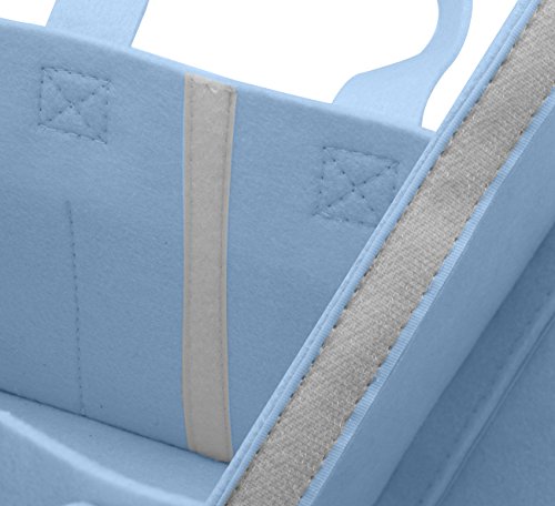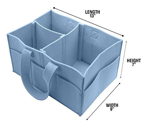 Made of high quality 100% felt (3mm non-woven). Includes 3 inside compartments with removable insert dividers and 8 outside pockets. Spot clean. (NOT Machine Washable). Baby Items NOT INCLUDED. Measures approximately 13" L x 9" W x 7" H (with handle 13.50")