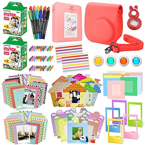 135 PIECE ACCESSORY KIT CONTAINS: 40 sheets of Fujifilm INSTAX Mini Instant Film, 1 Case, 1 Album, 4 Close up filters, 12 Marker pens, 10 Paper frames, 10 Bunny paper frames, 9 House Frames, 5 color plastic frames, 1 Selfie mirror lens, 2 sheets of corner stickers, & 40 piece film stickers