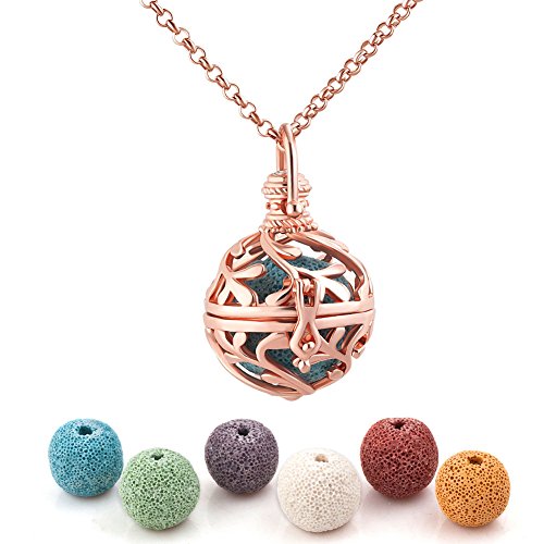 Third Time Charm Natural Lava Rock Stone Tree Of Life Necklace For Essential Oil Diffuser Aromatherapy Jewelry With 6 Lava Beads (Rose Gold Plated)