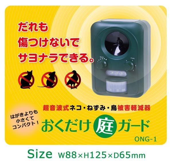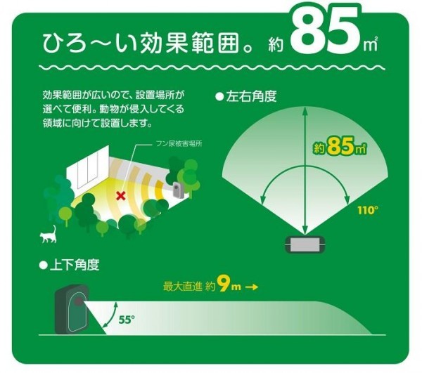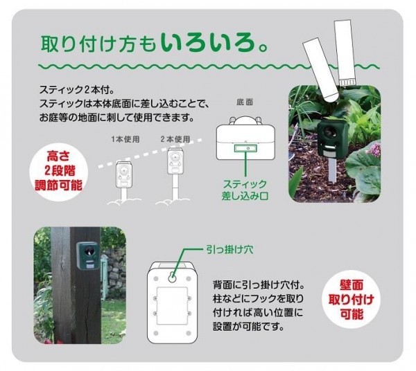 | 設定可能な周波数の超音波で、ネコ・ねずみ等の動物を遠ざけ、フラッシュライトにより鳥を遠ざけます。 |