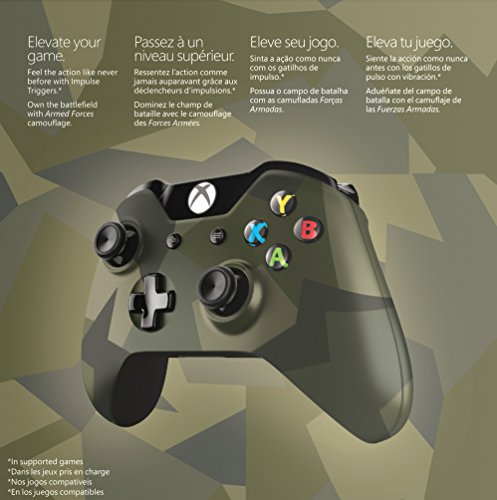 Own the battlefield with the camouflage Xbox One Special Edition Armed Forces Wireless Controller. It features Impulse Triggers, redesigned thumbsticks and D-pad enhancements for greater intensity, precision and comfort.
