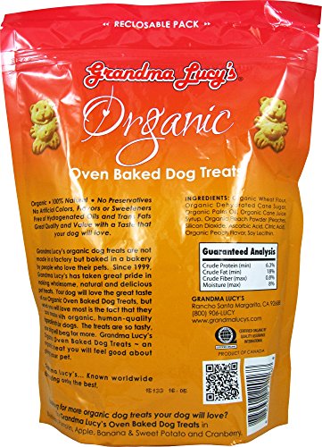 -. Feature : Organic Oven-Baked Dog Treats-Grandma Lucy's organic dog treats are not made in a factory but baked in a bakery by people who love their pets. Since 1999, Grandma Lucy's has taken great P.R.Ide in making wholesome, natural and delicious pet treats. Your dog will love the great taste of our Organic Oven-Baked Dog Treats, but what you will love most is the fact that they are made with organic, human-quality ingredients. The treats are so tasty, your dog will beg for more. / USDA Organic / Certified Kosher / Vegan