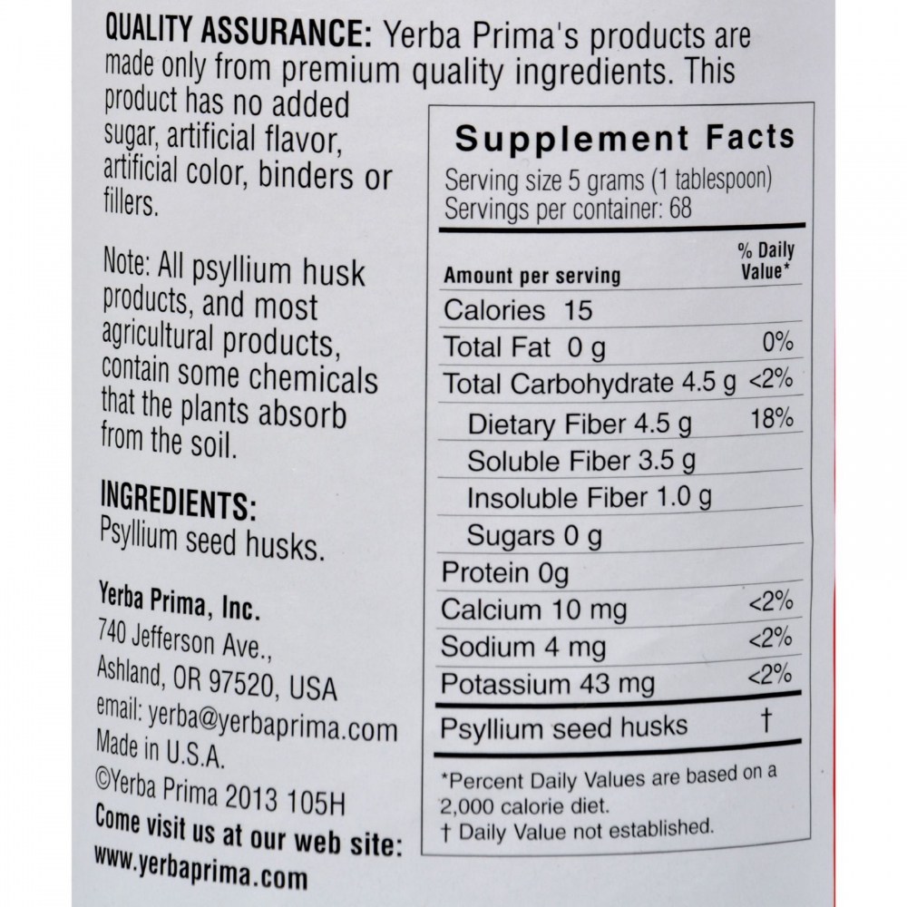 | Yerba Prima Psyllium Whole 겉껍질 - 12 Oz